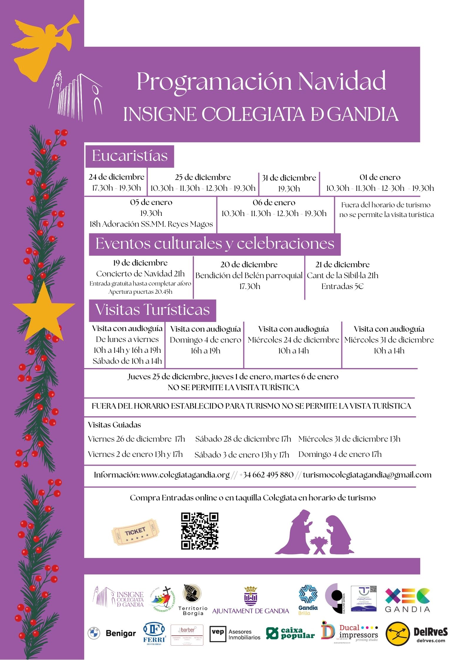 A la par la Colegiata de Gandia seguirá abierta al turismo este tiempo de Navidad. “Aprovechar las vacaciones de Navidad para conocer el patrimonio gandiense es una buena ocasión para ello”, destacan desde la iglesia madre de Gandia. Se ha ampliado el horario de visitas turísticas con audioguía y se han programado visitas guiadas especiales. En concreto los días, 26 y 28 de diciembre a las 17h y el miércoles 31 de diciembre a las 13h. El 2 y 3 de enero a las 13h y a las 17h; y el domingo 4 de enero a las 17h.