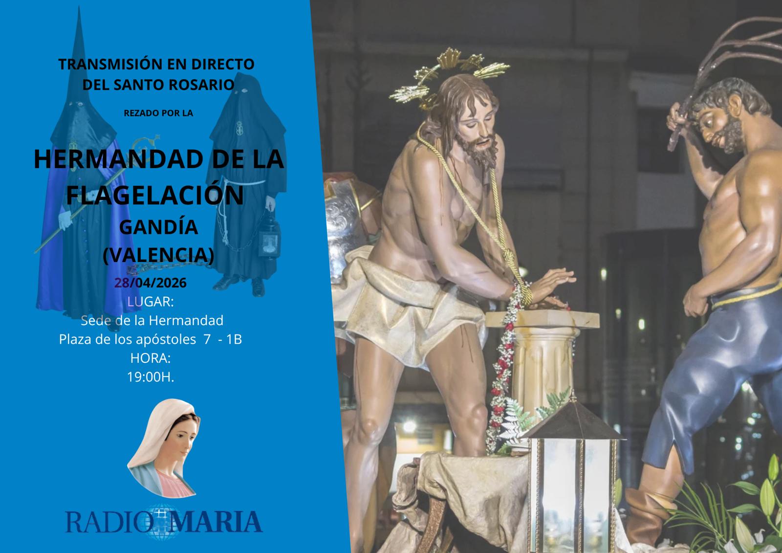 La Hermandad de la Flagelación de Gandía acogerá en su sede social (C/Abadía, 7 – al lado de la Insigne Colegiata de Gandía) la retransmisión del Rezo del Santo Rosario por las ondas de Radio María.